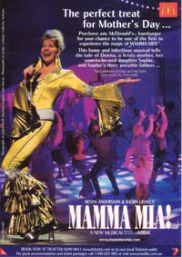 As is recorded elsewhere on this site, I'm obsessed enough with the ABBA musical Mamma Mia! to have flown myself to London a couple of years ago for the international premiere, and to have returned to see the show again a year later when I was next in that part of the world. Now another year has passed, but I've been saved the expense of going to London (at least for that), as Mamma Mia! finally gets its Australian premiere in Melbourne on June 9.I'm a little surprised it has taken so long to get here, given that ABBA were unarguably bigger in Australia than anywhere else in the world. Better late than never, however. I'm not actually hitting Melbourne for the premiere itself (as it's a long weekend and tickets were more or less impossible to get) but I will be there the following week, to see how many changes they've made (I'm expecting none), purchase any items of merchandise I don't have (which may not be many, as I've got practically everything from the London show) and just rock on. It would be nice if Bjorn made an appearance, but I'm not getting my hopes up at this stage. Of course, musical theatre is always a bit iffy in Australia, which is why Mamma Mia! has some unusual sponsors. In an ideal world, an ABBA musical wouldn't need to be promoted via leaflets handed out in Victorian branches of McDonald's, but as you can see from the accompanying illustrations, that's what's happened. (The picture is from the London production, and shows Louise Plowright, who took over the lead role of Donna in the show's second year.) This is undeniably tacky, but perhaps it has helped. The show has already extended its Melbourne season by two weeks, which suggests that it's a success. Of course, that will delay its eventual appearance in Sydney, but after two years, I figure I can be patient.