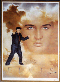 Like their dead idol, Elvis Presley fans are not renowned for their good taste or restraint. For many years, my local greasy takeaway shop had for sale an $80 portrait of the King, complete with a clock located somewhere in the vicinity of his crotch. It didn't sell for ages, but I'm sure that more than one person eyed it fondly as they queued for the exceptionally cheap chips.Not perhaps quite as unique, but certainly more expensive, is this latest offering from Franklin Mint, purveyors of tasteless overpriced crap to the masses, as advertised on the back cover of this week's New Weekly. "Own an original work of art from Graceland!" the ad proclaims. Viewing this piece, you shouldn't be surprised that it wasn't actually done until after Elvis' final cheeseburger gorge. The ad describes it as "a portrait so timeless, it is actually showcased in Graceland's permanent collection", but doesn't explain what sum of money changed hands as part of this process.
