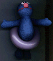 Regular readers will recall (I use that phrase a lot for someone with not very many readers) my complaint about how Grover, by far the most important Sesame Street Muppets, had been shunted aside to some extent by 80s red invader Elmo. You would have had to had your head stuck in a particularly deep pool of mud over Christmas not to realise just how true that was. Tickle Me Elmo became the holiday sensation, with idiotic Americans paying up to $660 in radio auctions just to get their kiddies their first vibrator. I myself took advantage of the break to troll the toyshops of Sydney, and found a depressingly low level of Grover merchandising.Fortunately, though, I didn't discover a total lack of fuzzy and blue things. I managed to pick up a Grover stamp (of the inkpad variety), so I'll be redecorating the walls of my house soon. And, even better, a friend of mine picked up the pictured Grover bath toy for me. It mightn't be very clear from this somewhat distorted shot, but Grover is made of cloth, yet still manages to float, thanks to the surgically attached plastic ring.