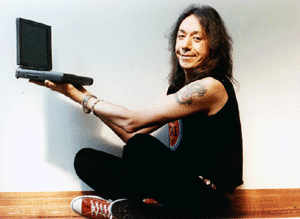 I'm digressing from my main point, though, which is to point out that when the band ditched their makeup around 1984, they turned out to look pretty much like any other rock band; long hair and leering expressions. Time, though, is a cruel and savage beast. As evidence, look no further than the recent picture of Ace Frehley (playing with a Mac PowerBook, no less), below. He's looking very . . . well . . . worn. I mean, I wouldn't mind his job and all, but you can see why he needs makeup now.