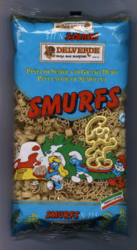 My devotion to Smurf collectibles is a matter of public record. So I was understandably thrilled when Mallory Keaton, one of the suitably pseudonymous contributors to Eye Of The Tigress, supplied me with this packet of Smurfs pasta (or 'Pasta di Semola di Grano Duro', if you wanna get technical). It's very hard to come by Smurf-shaped objects these days, let alone edible ones. As well as standard Smurf-shaped pasta, you can also consume Smurfette-shaped pasta, and even the occasional piece of pasta in the shape of Azrael, the cat owned by the evil wizard Gargamel.Immature reflection, though, made me realise that there's something a bit sick about the whole concept. The infamous Smurf sex story notwithstanding, there is something creepy about shoving a Smurf in your mouth. "This is digusting," said Steven Keaton, another Eye contributor. "As a connoisseur of pasta, I'm offended."