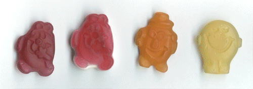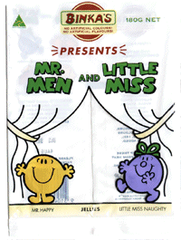 Back when Gusworld started in May 1997, one of the original features was the List Of Mr Men, which filled a pressing need at the time. Although it has since been dwarfed by other bits of content on the site, I still remain fond of the Mr Men. And thus I was greatly pleased when, wandering around Woolworths at lunchtime today in search of a sugar hit, I located a packet of Binka's Mr Men and Little Miss lollies (pictured left).Aside from the Mr Men/Little Miss shape, and the fact that some have a random coating of white sugary gelatiney stuff on the back, these taste pretty much like standard Binkas (whose other sweets use the slogan "Slightly less naughty then when you were kids"). What sets them apart is their use of four Mr/Little Miss characters: Mr Clever, Mr Happy, Little Miss Naughty (a favourite in lingerie shops, I've noticed recently) and Little Miss Chatterbox. Oh, and the fact that they have a warning on the back that says "Please keep these sweets away from heat to avoid the possibility of melting." Strangely enough, too, there were no Little Miss Chatterboxes in the bag I purchased, which is why Little Miss Naughty appears twice below. Perhaps she's set to become a collectible.